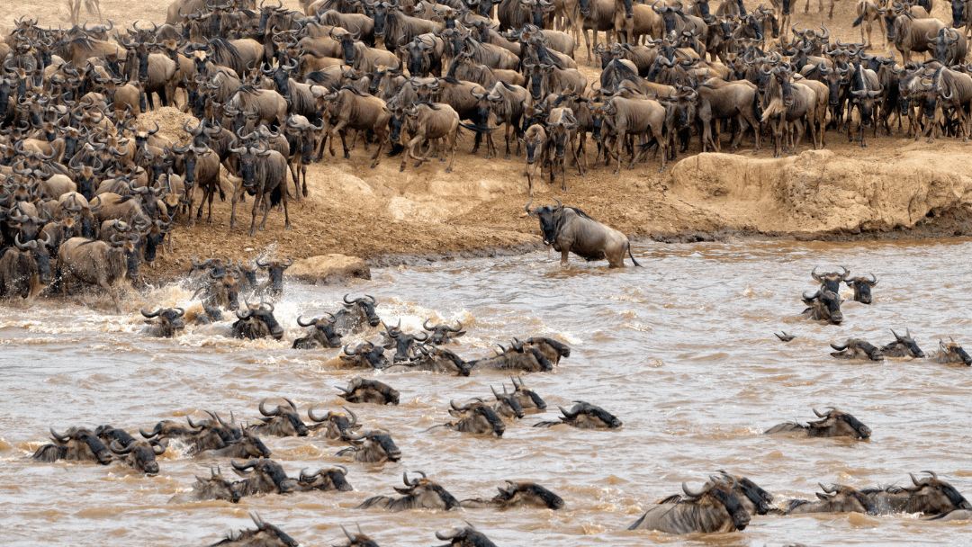 Chaque année, de juillet à octobre, des milliers de gnous, accompagnés de zèbres et d’antilopes, franchissent la rivière Mara, affrontant courants et prédateurs dans un périple épique. Ce phénomène attire également des animaux comme les lions et les crocodiles du Nil, créant des scènes de chasse saisissantes, observées par des visiteurs du monde entier.